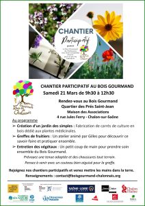 Calendrier détaillé des Chantiers participatifs avec les dates, horaires et thématiques de chaque chantier prévu sur le site du Bois Gourmand. Un flyer explicatif, précisant les détails pratiques, sera communiqué […]