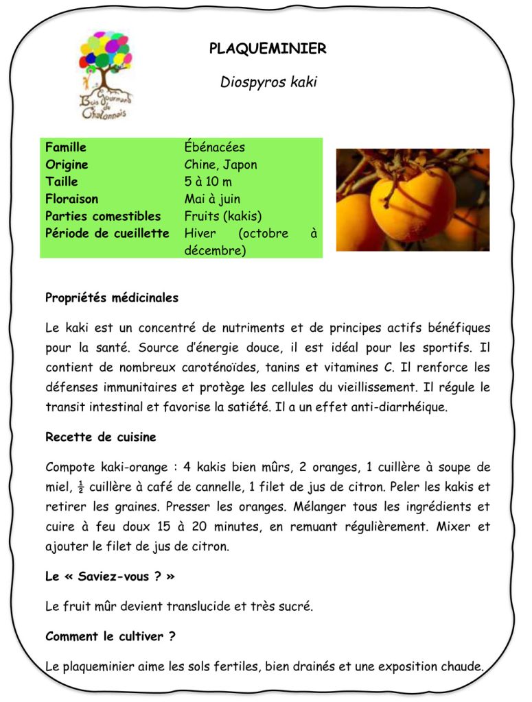 AccueilPlaqueminier Plaqueminier Plaqueminier – Diospyros kaki Anecdote : Le kaki est délicieux cru à maturité ou séché comme au Japon. Pour télécharger la fiche, c’est ICI